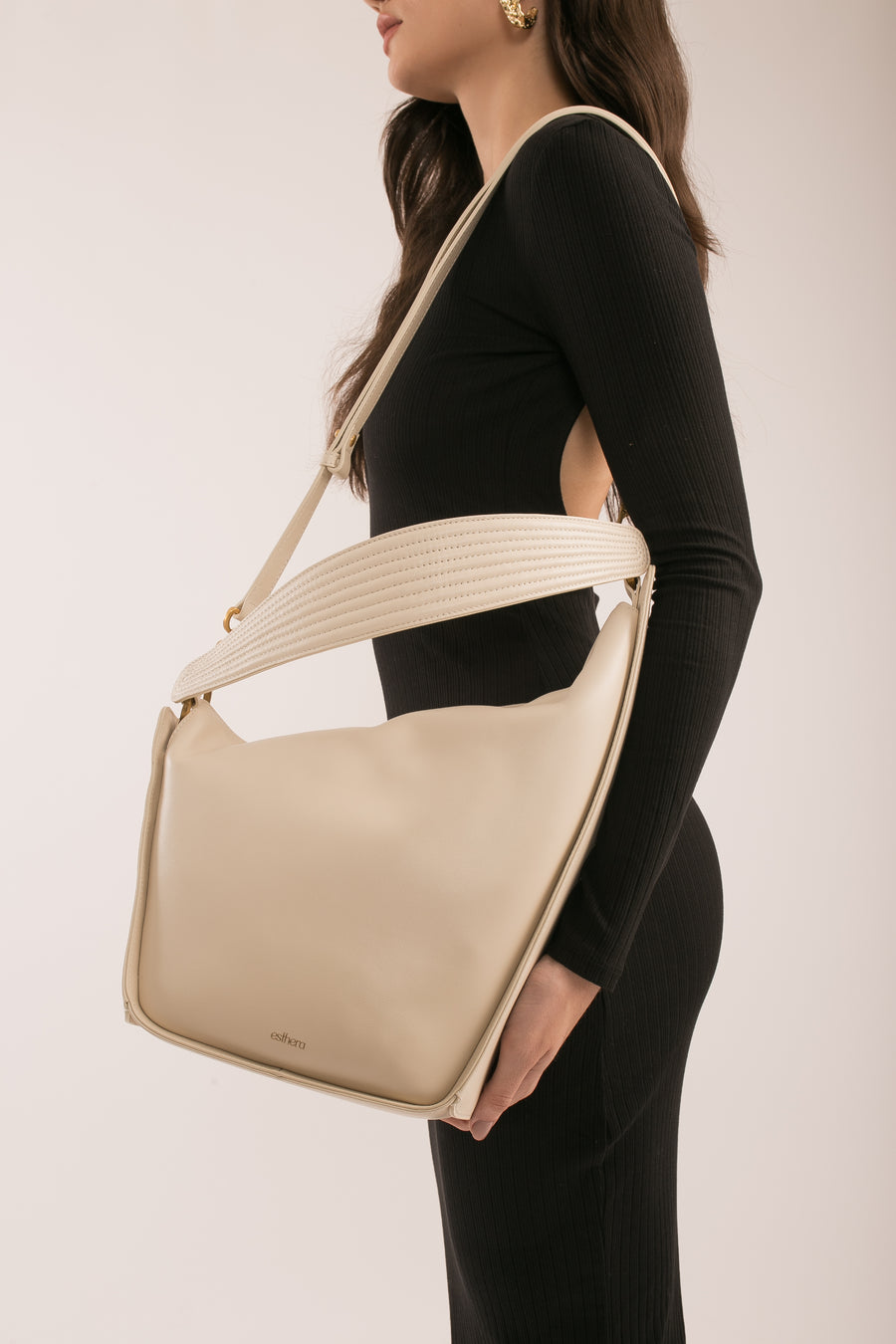 Bolsa 10AM Areia assimétrica, com abertura fácil de imã invisível.