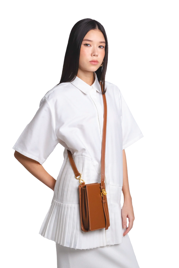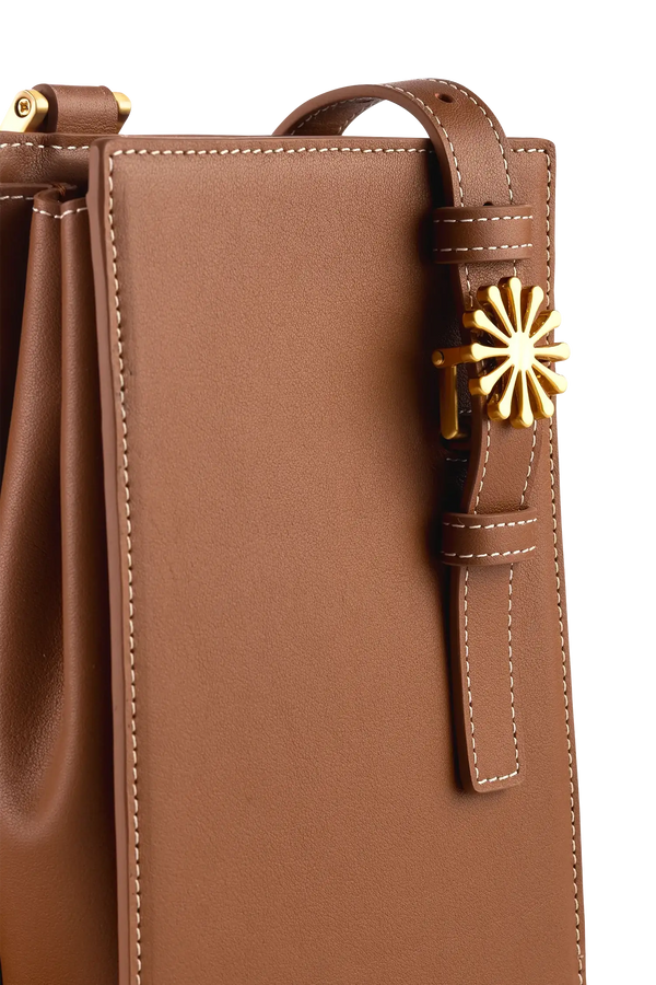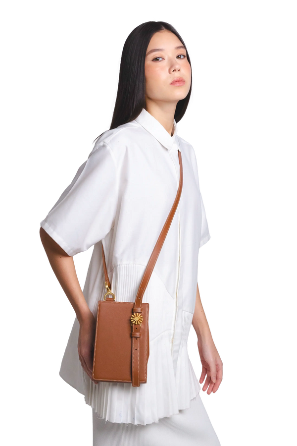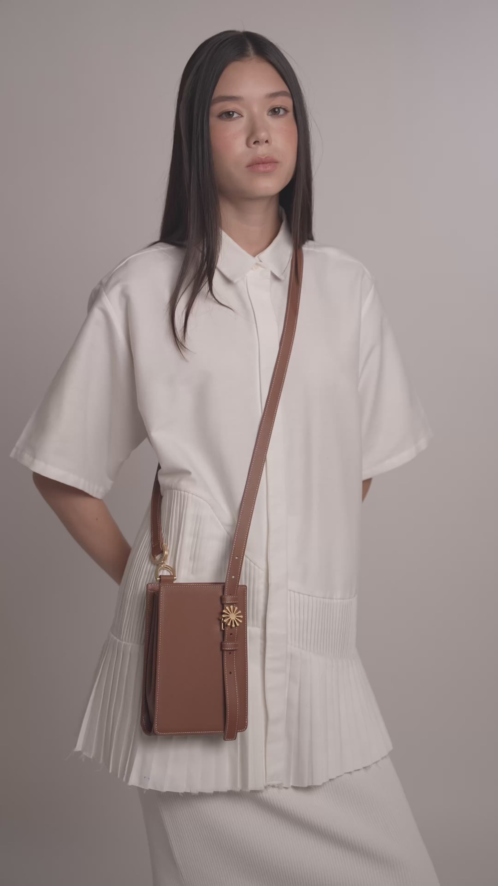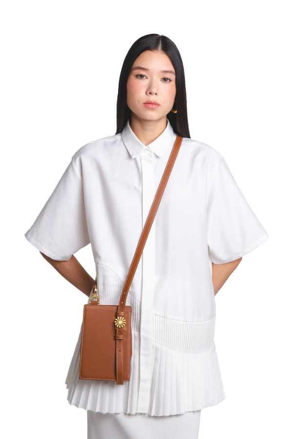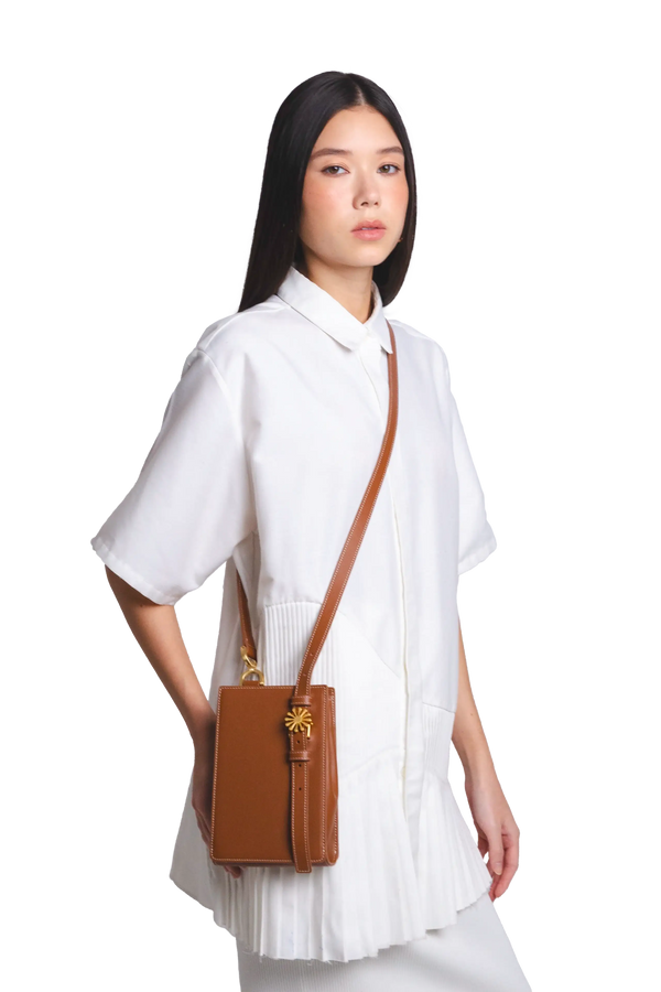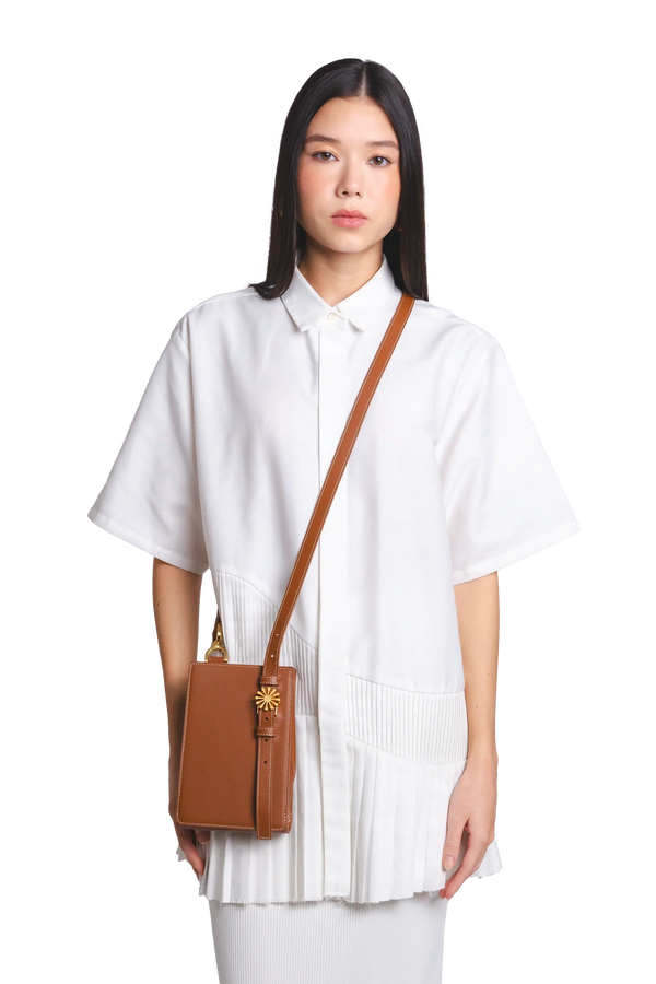 Bolsa tiracolo com design geométrico, estrutura compacta e laterais expansíveis. Traz alça longa estilo cinto com fivela estrela Esthera e ajuste prático. Ideal para usar tiracolo, com leveza e estilo.