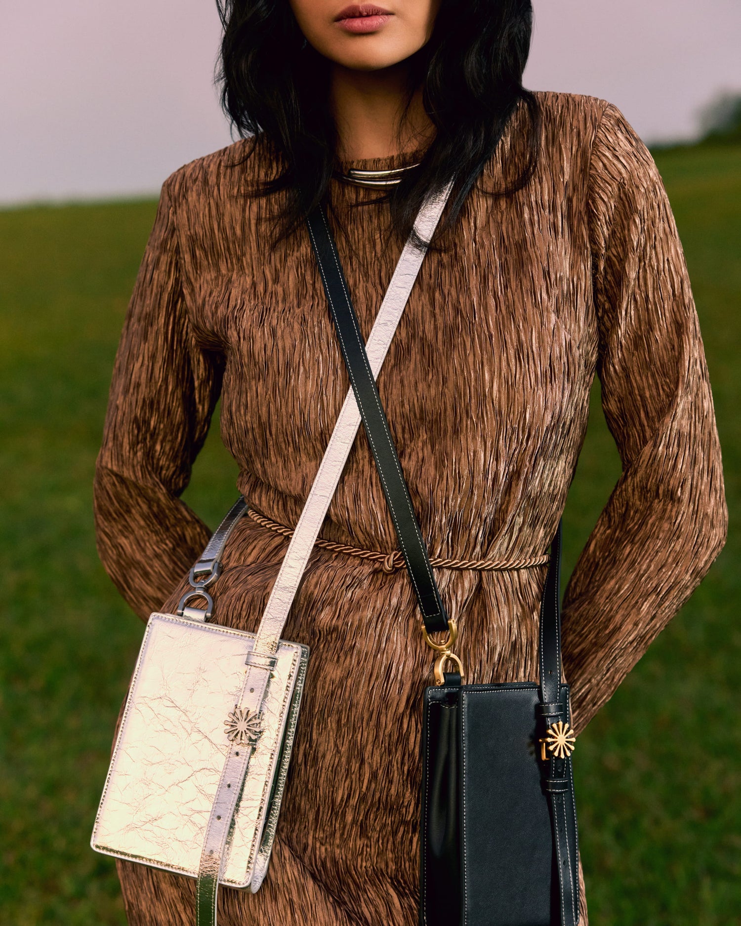 Bolsa tiracolo com design geométrico, estrutura compacta e laterais expansíveis. Traz alça longa estilo cinto com fivela estrela Esthera e ajuste prático. Ideal para usar tiracolo, com leveza e estilo.