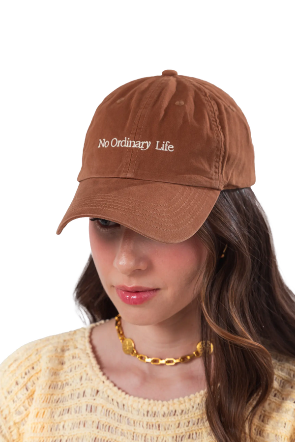 Boné caqui 100% algodão com bordado frontal da frase clássica “No Ordinary Life” e logo Esthera na parte de trás. Detalhe de estrela no regulador. Com design minimalista e contemporâneo, une durabilidade e acabamento impecável em um acessório versátil e atemporal, perfeito para dar identidade e estilo aos looks do dia a dia.